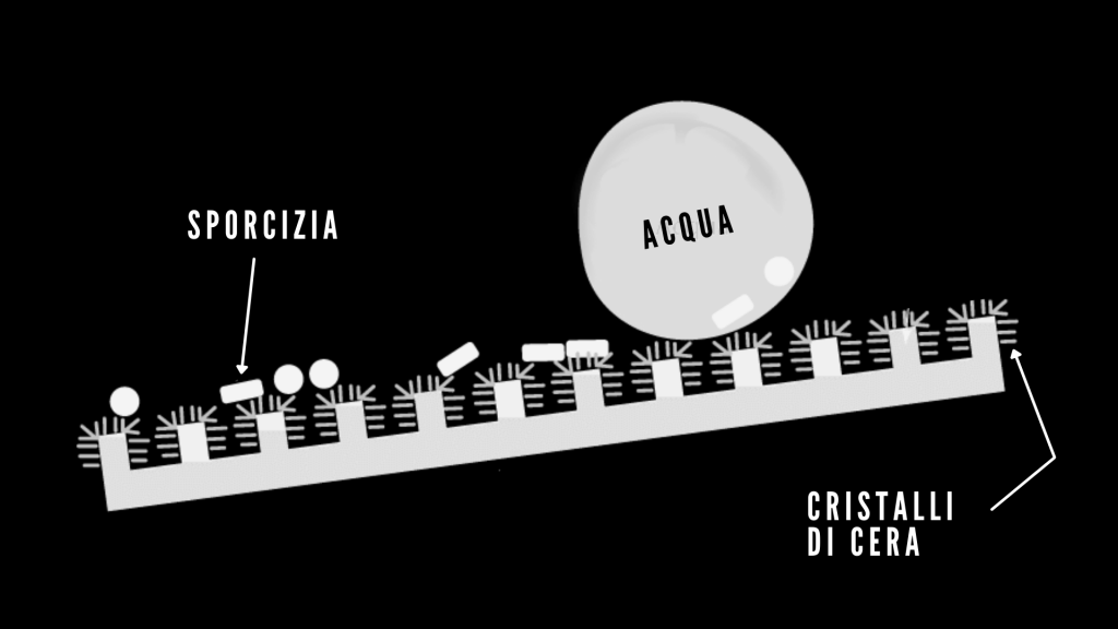 Tale fenomeno si verifica grazie ai cristalli di cera idrofobica di dimensioni nanometriche che vanno a rivestire la superficie rendendola ruvida e riducendo l’area di contatto.